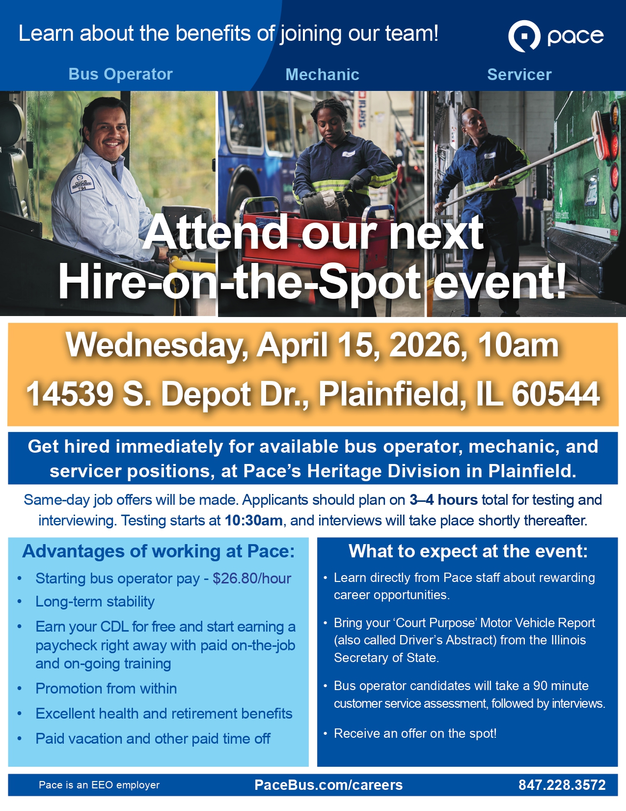 Get hired immediately for available bus operator, mechanic, and servicer positions, at Pace’s Heritage Division in Plainfield.